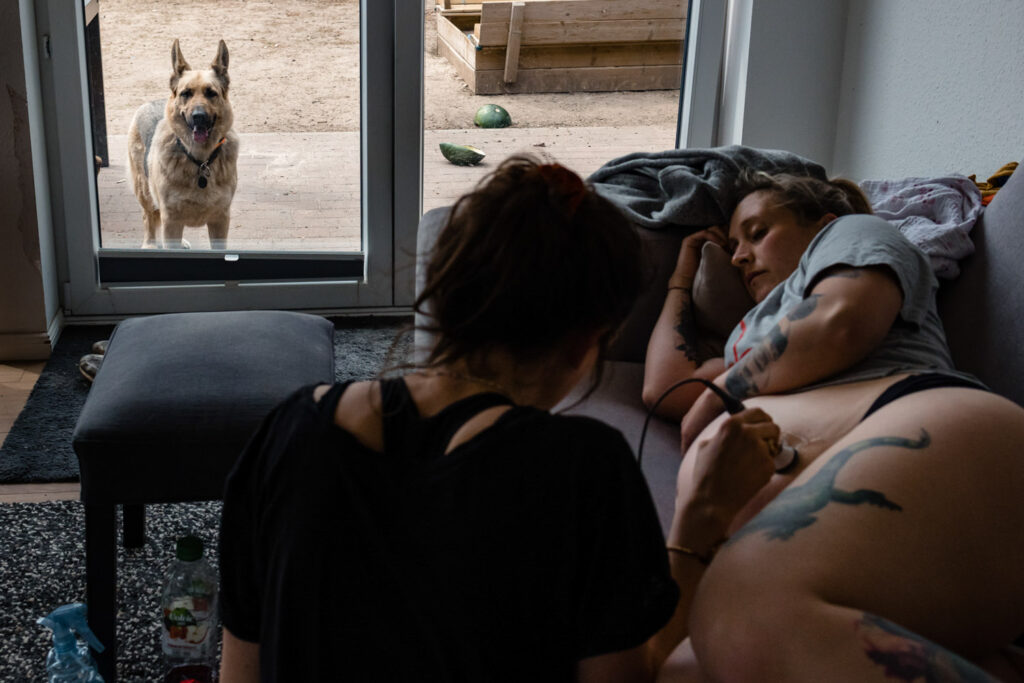 Die Wehenabstände sind immer noch lang als wir zurück kommen. Wir geben euch Raum, machen Pause. Diese Pause scheinst du gut zu nutzen, schon nach einer halben Stunde kommt der Anruf. Als ich deine Mama höre weiß ich, du bist schon ganz nah. Von deinem Papa umsorgt kniet sie vor der Couch. Deine Schwester zieht es auch wieder ins Haus, zu euch. Mama streicheln. Auf Omas Schoß kuscheln. Eis essen. Für mich eine ganz neue Geburtstimmung, Sonntagnachmittag-Familienleben und mitten drin Geburt. Wie wunderbar, wie selbstverständlich, wie schön!